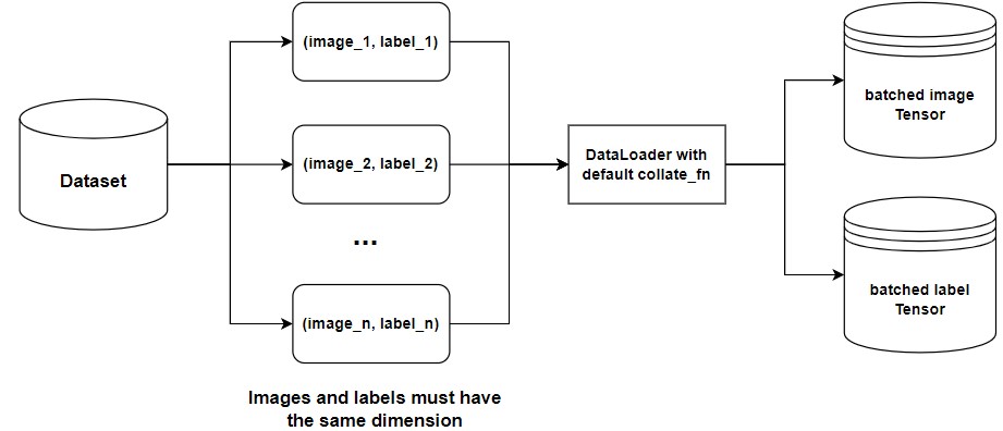 Default collate_fn collates a list of tuple into a single tuple of a batched image Tensor and a batched class label Tensor. In particular, the default collate_fn has the following properties: