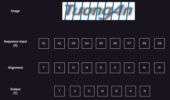 To get around these problems, CTC use a new character to the set of allowed outputs $\epsilon$ (blank character). The $\epsilon$ character doesn’t correspond to anything and is simply removed from the output. The below figure describes steps that how to map to $Y$ (Target $Y$ is TUONGANN) after merging repeats and removing blank characters.