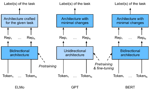 As we have seen, ELMo encodes context bidirectionally but only applies task-specific architecture; while GPT is task-agnostic but encodes context left-to-right. Combining the best of both worlds, BERT encodes context bidirectionally and requiries minimal archtecture changes for a wide range of NLP tasks: