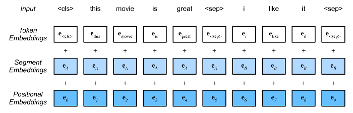 BERT chooses the Transformer encoder as it bidrectional architecture. The different from the original Transformer encoder, BERT use segment embeddings and learnable positional embeddings. Finally, the embeddings of the BERT input sequence are the sum of the tokens embeddings, segment embedding and positional embedding.