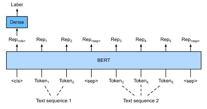 BERT input sequence is concatenation of $<$cls$>$, tokens of the first text sequence, $<$sep$>$, tokens of the second text sequence, $<$sep$>$