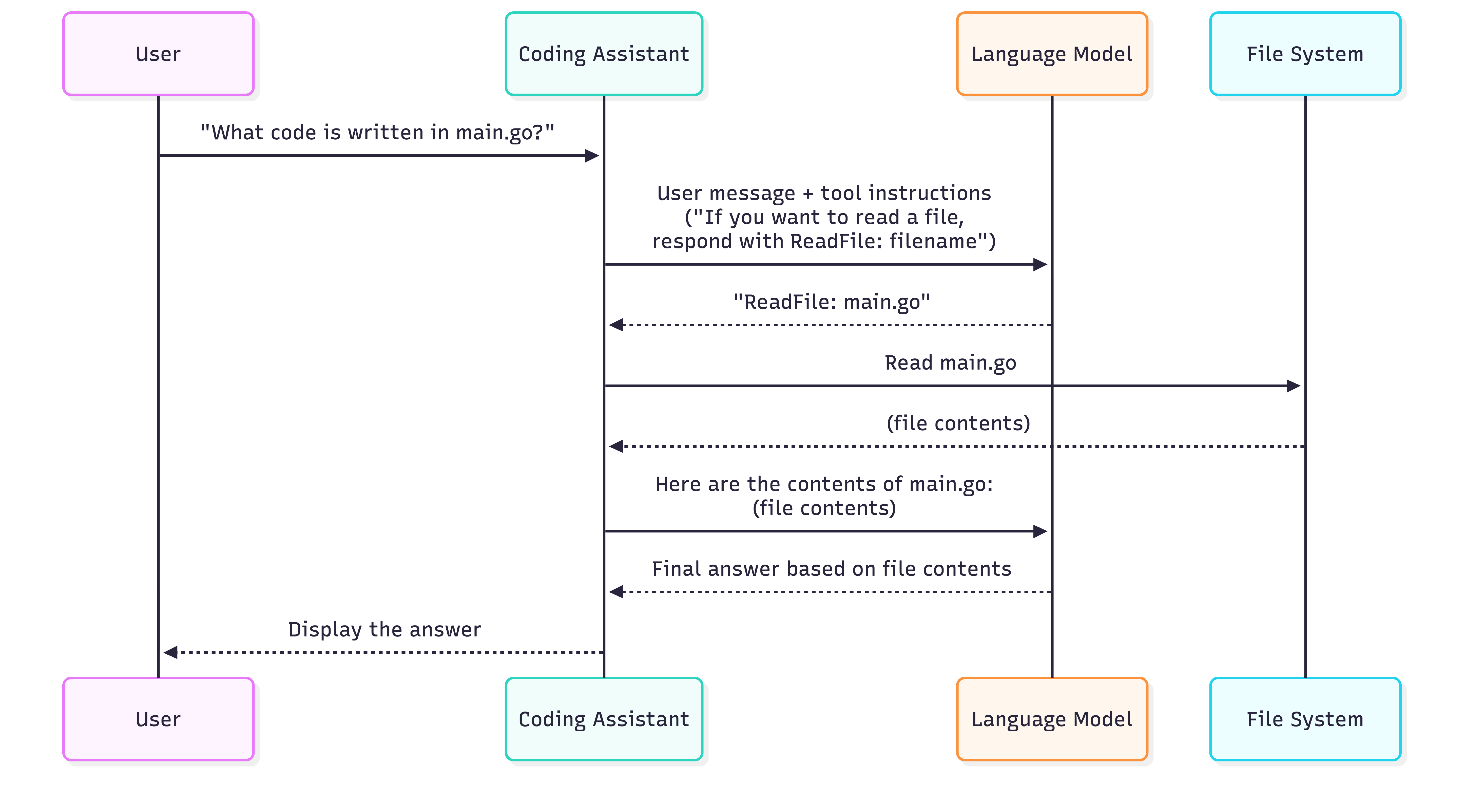 Language models by themselves can only process text and return text. That means they cannot actually read files or run commands. If you ask a standalone language model to read a file, it will tell you it doesn’t have that capability.